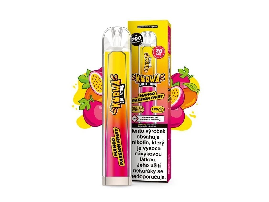 Jednorázová e-cigareta KURWA Collection VAPE Mango Passion Fruit nabízí tropickou kombinaci sladkého manga a šťavnaté maracuji. Obsahuje nikotinovou sůl 20 mg, náplň 2 ml a vydrží přibližně až 700 potahů. Integrovaná baterie 500 mAh umožňuje okamžité použití bez dobíjení nebo doplňování.
